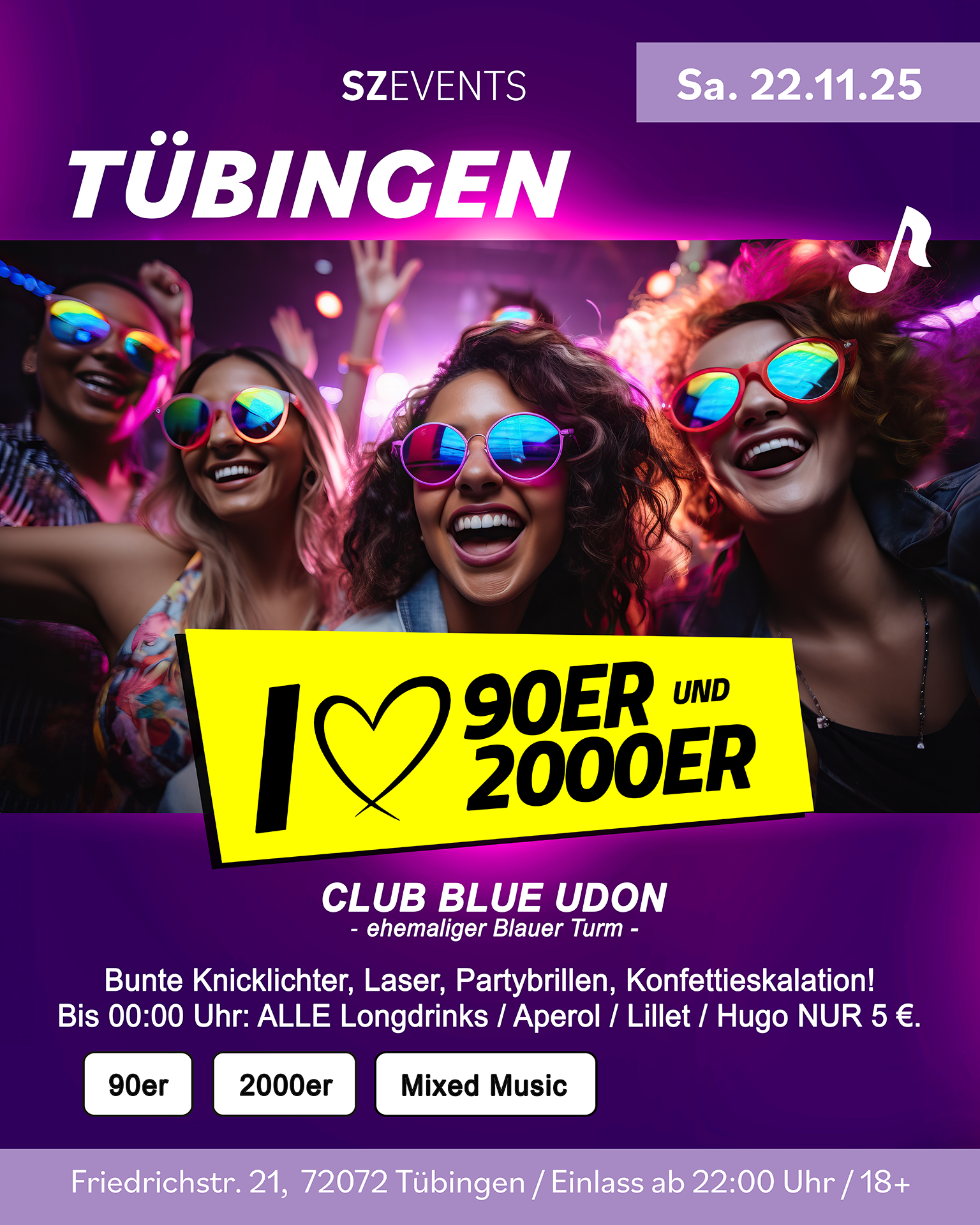 XXL Neueröffnung Blue Udon (ehemaliger blauer Turm)! mit unserer „I LOVE 90er & 2000er“ Party in Tübingen! Bunte Knicklichter, Laser, Partybrillen, Konfettieskalation +++ Bis 23:00 Uhr: ALLE Longdrinks, Aperol, Lillet, Hugo NUR 5,-