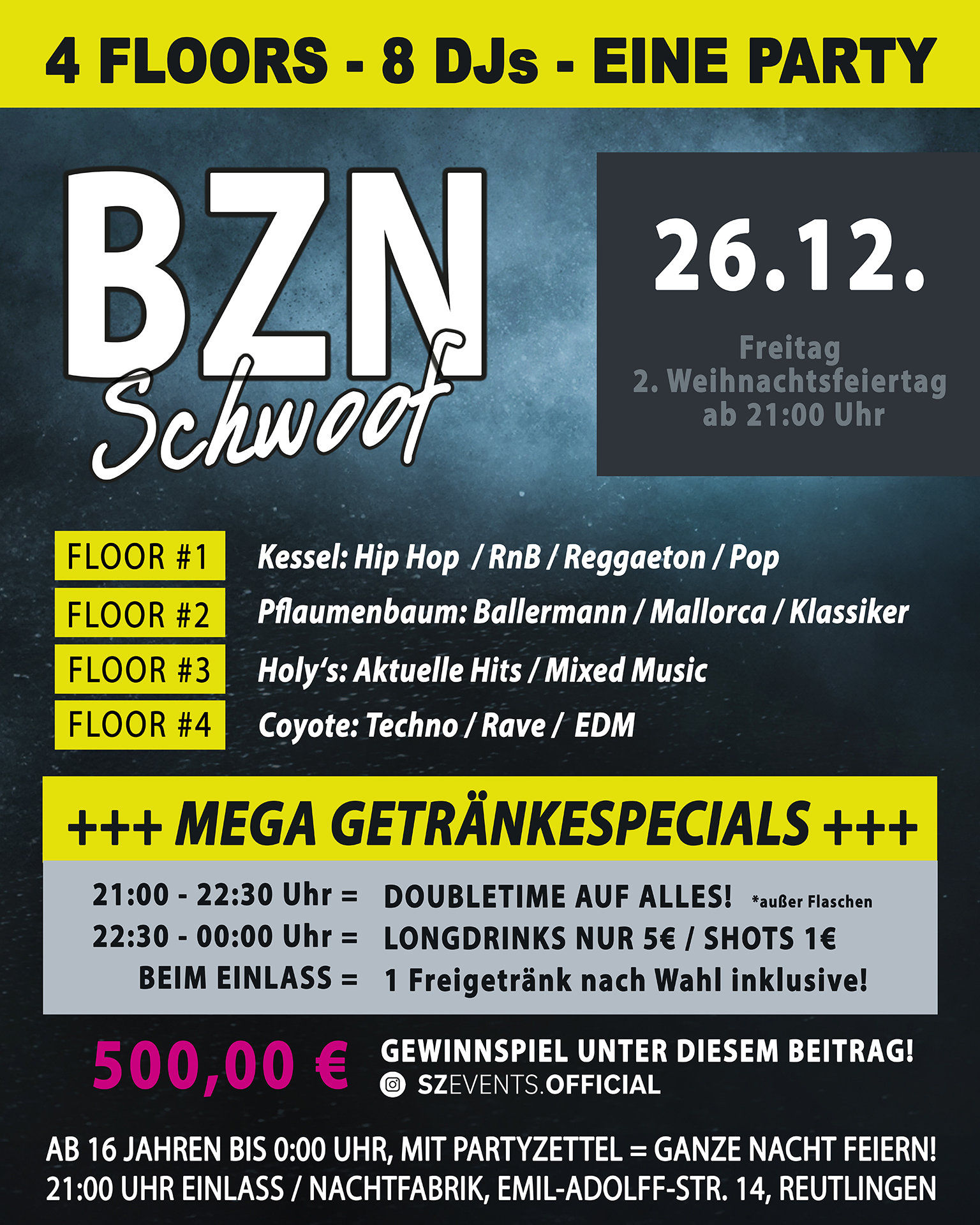 DIE GRÖẞTE PARTY DES JAHRES!! 26. Dezember (2.Weihnachtsfeiertag) = BZN in der kompletten Nachtfabrik Reutlingen! Pflaumenbaum + Kessel + Holys + Coyote = EINE XXL Party mit 4 Floors und 8 DJ’S! 500,00 Euro GEWINNSPIEL JETZT unter unserem INSTAGRAM-Betrag des Events auf @szevents.official