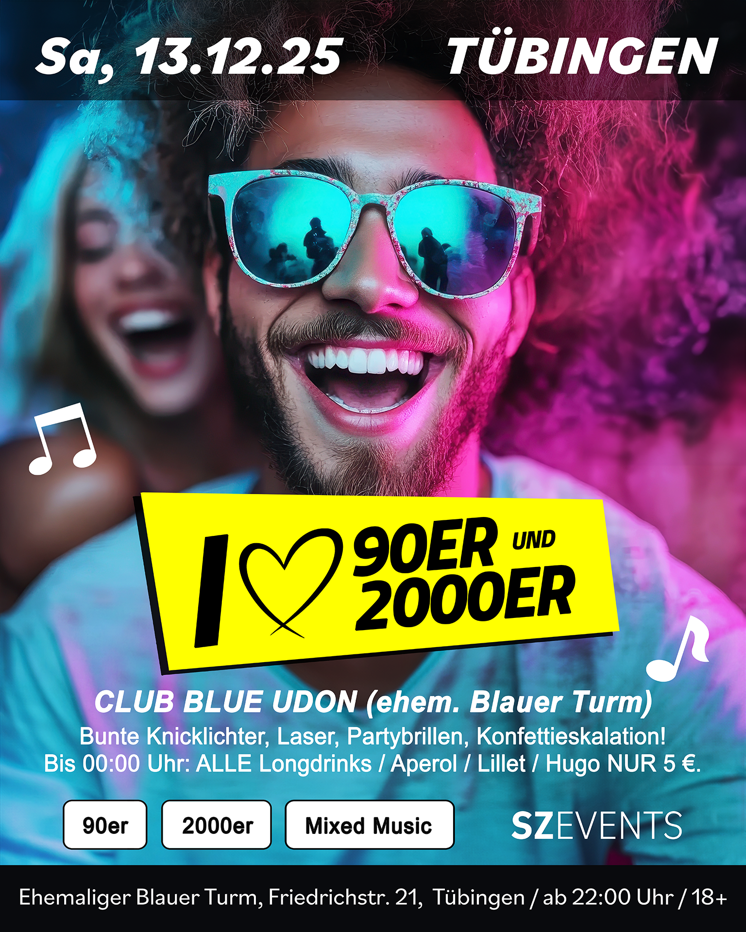 Weiter gehts mit PART II im Blue Udon (ehemaliger blauer Turm)! XXL „I LOVE 90er & 2000er“ Party in Tübingen! Bunte Knicklichter, Laser, Partybrillen, Konfettieskalation +++ Bis 23:00 Uhr: ALLE Longdrinks, Aperol, Lillet, Hugo NUR 5,-